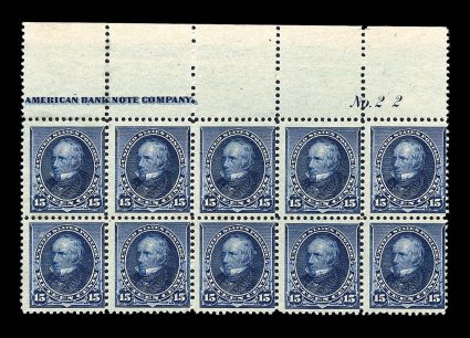 1371 ogPB 227 image#227, 15c Indigo, full top margin imprint and plate "No. 22" block of ten, lovely rich color on fresh paper, full o.g., lightly hinged, some separated perfs. have been expertly rejoined (including much of the top left "section" of the selvage), fine; a highly collectable example of this rare plate block. (Image) $9,250.00
