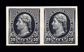 1373 og 228a image#228a, 30c Black imperforate, horizontal pair, large margins all around, intense color, o.g., lightly hinged, extremely fine; 1990 PF certificate. (Image) $1,000.00