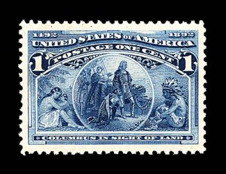 1375 nh 230 image#230, 1c Columbian, a jumbo mint single, with four enormous margins and being perfectly centered within them, strikingly intense color in a deep shade, crisp impression as well on fresh white paper, o.g., n.h., extremely fine and striking; 1988 PF certificate; ex-Higgins. (Image) 47.50