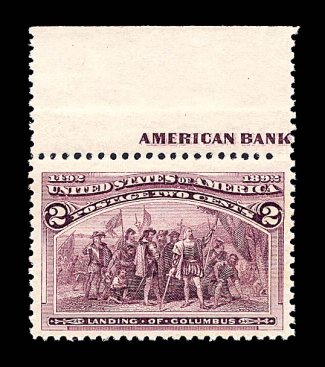 1379 nh 231 var. image#231 var., 2c Columbian, "broken hat" variety, a magnificently choice top sheet-margin partial imprint mint example of this popular variety, wonderfully bright and fresh, with gorgeous rich color and impression on bright white paper, incredibly well centered within extravagantly large margins, immaculate o.g., n.h., an extremely fine gem that is among the very finest we have ever seen of this variety; photocopy of a 1994 PSE certificate for an imprint block of four, this being the top left stamp. (Image) $130.00