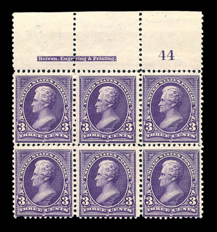 1442 nhPB 253 image#253, 3c Purple, full top margin imprint and plate no. 44 block of six, bright and fresh, o.g., n.h., some minor perf. separation at left, fine and scarce. (Image) $2,500.00