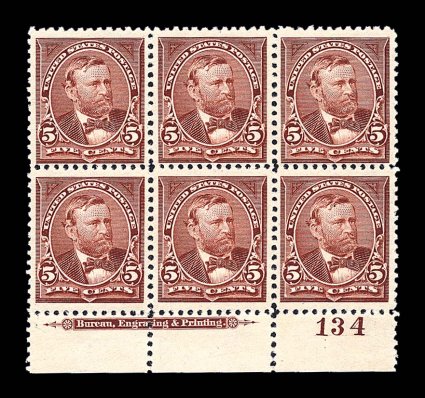 1446 ogPB 255 image#255, 5c Chocolate, bottom margin imprint and plate no. 134 block of six, the bottom stamps are particularly well centered, strong rich color on fresh paper, o.g., lightly hinged, very fine. (Image) $1,200.00