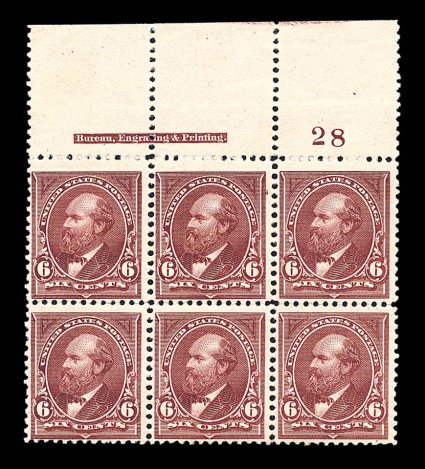 1448 ogPB 256 image#256, 6c Dull brown, full top margin imprint and plate no. 28 block of six, fresh color and paper, o.g., lightly hinged, light gum bend at bottom right, a very fine example of this scarce and difficult plate block. (Image) $2,900.00