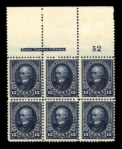 1451 ogPB 259 image#259, 15c Dark blue, full top margin imprint and plate no. 52 block of six, deep prooflike color and impression, o.g., lightly hinged, light corner bend at bottom right and small spot of discoloration in the top right selvage, still a fine and highly collectable example of this rarely offered plate block. (Image) $5,000.00