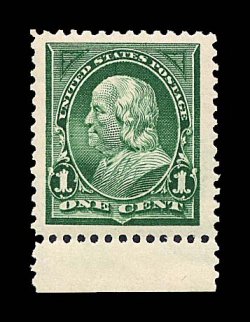 1484 nh 279 image#279, 1c Deep green, a mind-boggling mint single of immense proportions, being a bottom sheet-margin example sporting the most enormous margins imaginable, and quite remarkably it is incredibly well centered, intense color, o.g., n.h., superb; 1990 PF certificate; ex-Morris. (Image) $21.00