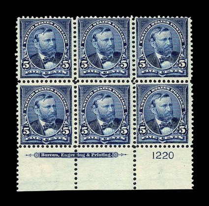 1487 ogPB 281 image#281, 5c Dark blue, bottom margin imprint and plate no. 1220 block of six, deeply rich color, o.g., lightly hinged, fine-very fine. (Image) $650.00