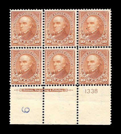 1490 ogPB 283 image#283, 10c Orange Brown, Ty.II, full bottom margin imprint and plate no. 1338 block of six, bright color, full o.g. that is slightly disturbed from hinge removal, reinforced perfs. between the top and bottom rows, light horizontal crease in the selvage, fine appearance. (Image) $1,750.00