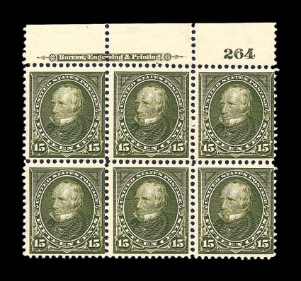 1493 ogPB 284 image#284, 15c Olive green, top margin imprint and plate no. 264 block of six, deep prooflike color and impression, o.g., hinge mark in selvage may just affect the top middle stamp, otherwise n.h., fine and a scarce plate block. (Image) $2,100.00