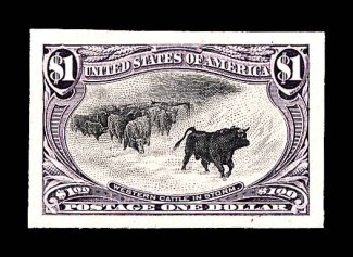 1494 E 285-E8 to 293-E-7 image#285-E8 to 293-E7, 1c-$2.00 Trans-Mississippis, bicolored die essays cplt., on India with original card backing, each cut to stamp size with attractive even margins, vignettes are in black with the frames in the issued colors except for the $1.00 which is in violet, a very fine and handsome set showing how the Trans-Mississippis were originally intended to be issued. (Image) Est. 750-1,000