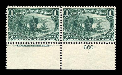 1495 nh 285 image#285, 1c Trans-Mississippi, bottom margin imprint and plate no. 600 pair, extraordinarily well centered within large margins, rich vibrant color, o.g., n.h., extremely fine. (Image) $140.00+