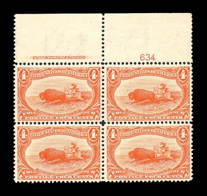 1497 nhPB 287 image#287, 4c Trans-Mississippi, full top margin imprint and plate no. 634 block of four, excellent centering, brilliantly fresh color, pristine o.g., never hinged, minor perf. separation at top left, choice very fine; an especially select example; clear 1990 PF certificate. (Image) $1,500.00