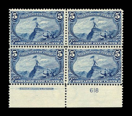 1499 ogPB 288 image#288, 5c Trans-Mississippi, bottom margin imprint and plate no. 618 block of four, strong fresh color, o.g., lightly hinged, very fine. (Image) $825.00
