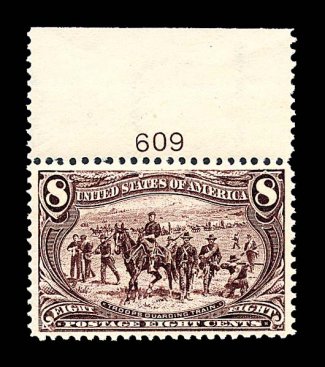 1500 nh 289 image#289, 8c Trans-Mississippi, an incredibly choice top sheet-margin plate no. 609 single, featuring several physical attributes not often associated with this challenging value, including possessing the most spectacularly intense color we have ever seen on this value, plus its impression could not be more deeply etched on brilliantly fresh paper, marvelously well centered, immaculate o.g., n.h., extremely fine; a very scarce and desirable stamp in this gem quality; 2001 PF certificate. (Image) 425.00