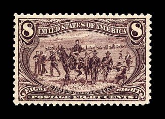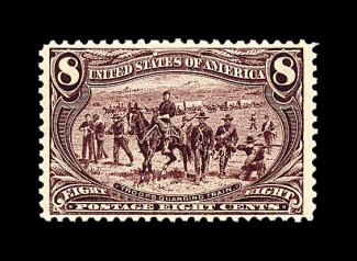 1501 og 289 image#289, 8c Trans-Mississippi, excellent centering within unusually large margins for this notoriously difficult value, intense color and impression on bright white paper, o.g., barest trace of hinging (if at all), extremely fine. (Image) $180.00