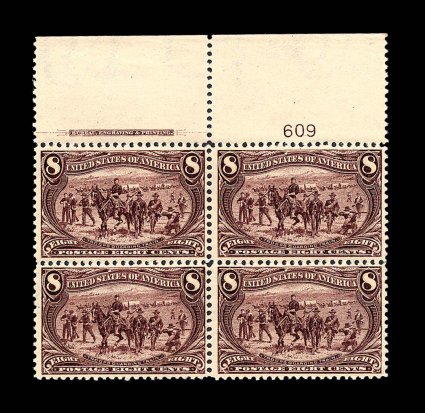 1503 nhPB 289 image#289, 8c Trans-Mississippi, handsome full top margin imprint and plate no. 609 block of four, uncharacteristically well centered for this difficult stamp, rich luxuriant color, o.g., never hinged, very fine and quite desirable. (Image) $3,000.00