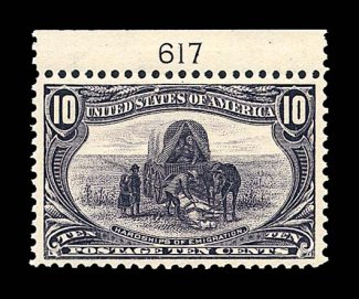 1504 nh 290 image#290, 10c Trans-Mississippi, gem top sheet-margin plate no. 617 single, exceedingly well centered within very large margins, but just as impressive is this stamp's incredibly intense color in an unusually deep shade, plus its impression is well incised on bright fresh paper, o.g., n.h., extremely fine; an especially choice never hinged Ten Cent Trans-Mississippi; 2001 PF certificate. (Image) 425.00