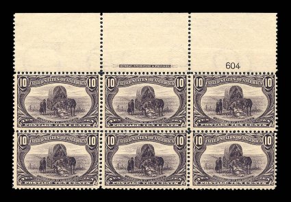 1507 ogPB 290 image#290, 10c Trans-Mississippi, full top margin imprint and plate no. 604 block of six, lovely rich color, o.g., faint trace of hinging, some sensible perf reinforcing, fine; particularly scarce as a full top. (Image) $3,250.00