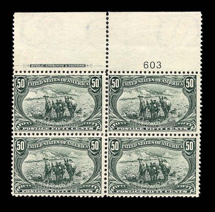 1510 ngPB 291 image#291, 50c Trans-Mississippi, full top margin imprint and plate no. 603 block of four, unused, strong rich color and impression, expertly regummed, fine-very fine; a very rare plate block in any condition; 1974 PF certificate as original gum. (Image) $14,000.00