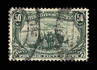 1508 og 291 image#291, 50c Trans-Mississippi, a most impressive mint example that is exceptionally well centered within lavishly large margins, beautiful prooflike color and impression on bright white paper, o.g., lightly hinged, extremely fine and quite handsome; 1980 PF certificate (Image) $700.00