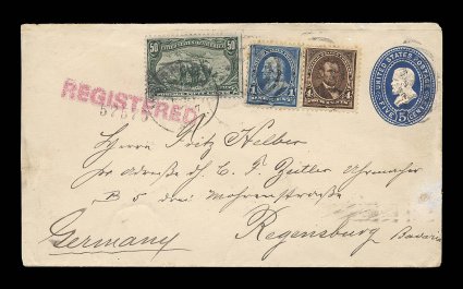1512 c 291 image#291, 50c Trans-Mississippi, rich color, natural straight-edge at right, tied along with 1c Blue and 4c Brown Bureau stamps by indistinct c.d.s. postmarks on registered 5c Entire to Germany (backstamp), 50c stamp also tied by magenta straightline "REGISTERED", New York transit backstamp, cover opened at left and top, cover with small sealed tear at left and slight surface abrasion at right, neither affecting the adhesives or markings, two Bureau stamps with faint perf. tip toning, fine. (Image) $1,750.00