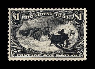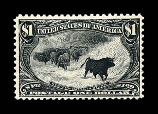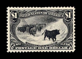 1514 og 292 image#292, $1.00 Trans-Mississippi, brilliantly fresh mint example, exceptionally strong prooflike color and impression on pristine paper, well centered, full clean o.g. that was never hinged, however some slight moisture seeped in on the reverse of a plastic mount causing a small moisture "line" in the center (and the gum is only minutely thinned), otherwise very fine; accompanied by 1995 and 2000 PF certificates, both of which described the stamp as "never hinged". (Image) 1,250.00