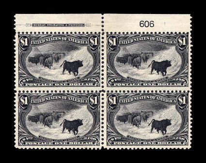 1517 ogPB 292 image#292, $1.00 Trans-Mississippi, top margin imprint and plate no. 606 block of four, rich color and a crisp impression, full clean o.g., lightly hinged, faint thin spot in the ungummed selvage at right, otherwise a fine example of this important commemorative plate block rarity. (Image) $35,000.00