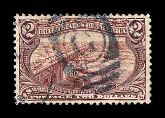 1519 O 293 image#293, $2.00 Trans-Mississippi, used, exceedingly well centered within much larger margins than normally seen on this tightly spaced stamp, deep luxuriant color, duplex cancel, extremely fine; a premium used example of this high value; 1999 PSE certificate. (Image) $1,000.00