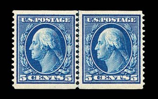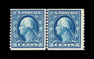 #351, 5c Blue coil, perf. 12 horiz., used pair,