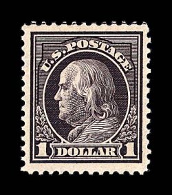 1763 nh 423 image#423, $1.00 Violet brown, a most extraordinary mint example of this scarce high value, being in a quality matched by few others, featuring outstanding centering within extravagantly large margins which are most uncharacteristic, incredibly deep rich color and a well incised impression on bright paper, o.g., n.h., extremely fine; a gem never hinged 1912 One Dollar Franklin; 1978 PF and 2001 PSE certificates; ex-Floyd. (Image) 1,150.00
