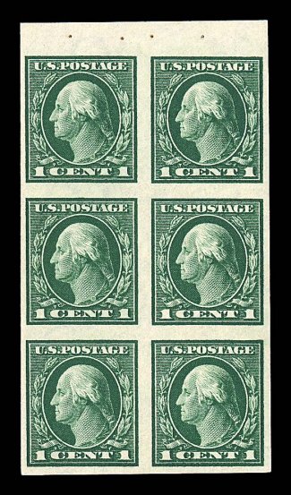 1765 ogBP 424e image#424e, 1c Green booklet pane of six, imperforate, unused, without gum as are all known examples, large wonderfully balanced margins, deep luxuriant color, extremely fine; an especially choice example of this important booklet pane error, of which only 60 are thought to exist; 2004 PF certificate. (Image) 1,600.00
