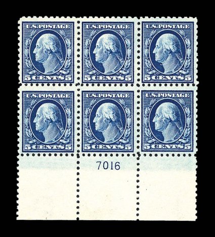 1771 nhPB 428 image#428, 5c Blue, full bottom margin plate no. 7016 block of six, deep intense color on fresh white paper, o.g., n.h, fine-very fine. (Image) $625.00