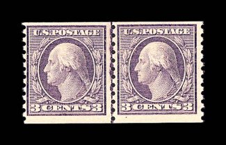 1821 nh 456 image#456, 3c Violet rotary coil, Ty. I, perf. 10 vert., pristine joint line pair, characteristic bright color with clean impression on crisp paper, immaculate o.g., n.h., fine-very fine; 1987PF certificate. (Image) $2,500.00