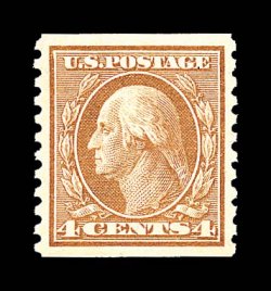 1822 nh 457 image#457, 4c Brown rotary coil, perf. 10 vert., precisely centered amid uncharacteristically large margins, rich color and a razor-sharp impression, o.g., n.h., extremely fine; a gem mint coil single; 1995 PF certificate for a strip of four from which this stamp was taken. (Image) 55.00