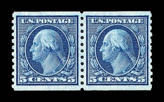 1823 nh 458 image#458, 5c Blue rotary coil, perf. 10 vert., pair, select centering within very large margins, strong rich color, o.g., n.h., extremely fine; a gem coil pair; 1999 PF certificate. (Image) 145.00