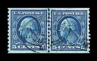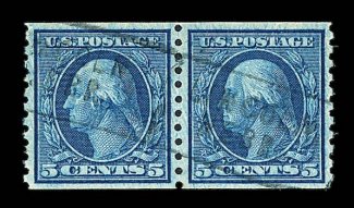 1824 O 458 image#458, 5c Blue rotary coil, perf. 10 vert., used pair, exceptionally well centered, deeply rich color, lightly cancelled, extremely fine; 2000 PF certificate. (Image) $60.00