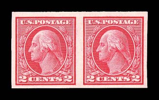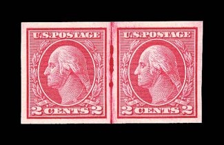 1828 og 459 image#459, 2c Carmine imperforate coil, attractive mint pair, large margins all around, rich color, o.g., very lightly hinged, extremely fine; 1984 PF certificate. (Image) $475.00