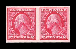 1829 nh 459 image#459, 2c Carmine imperforate coil, joint line pair, exceedingly well centered with large balanced margins, brilliantly fresh and crisp, light crease, as usual, affecting the left stamp, otherwise extremely fine and attractive. (Image) $1,600.00