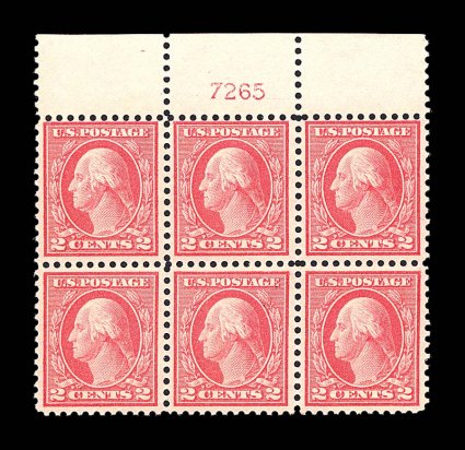 1835 ogPB 461 image#461, 2c Pale carmine red, top margin plate no. 7265 block of six, the bottom stamps are especially well centered, bright color, o.g., lightly hinged, bottom right stamp n.h., very fine overall. (Image) $1,500.00