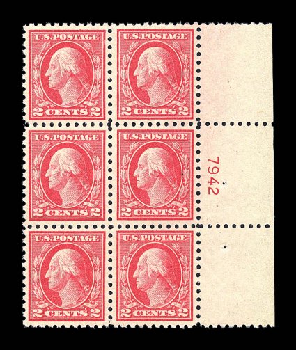 1838 nhPB 463 image#463, 2c Carmine, Ty. I, full right margin plate no. 7942 block of six, well centered, bright fresh color, o.g., n.h., very fine and choice. (Image) $210.00