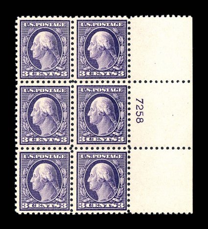 1840 nhPB 464 image#464, 3c Violet, full right margin plate no. 7258 block of six, strong fresh color, pristine o.g., n.h., fine-very fine; a surprisingly elusive plate block to find in never hinged condition; 2001 PF certificate. (Image) $2,200.00