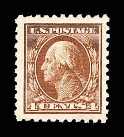 1842 nh 465 image#465, 4c Orange brown, striking mint single, possessing jumbo margins and being wonderfully well centered within them, gorgeous intensely rich color and a razor-sharp impression, immaculate o.g., n.h., miniscule short gumming at left, still an extremely fine gem and certainly one of the largest perforated 10 unwatermarked Four Cent stamps available. (Image) $95.00