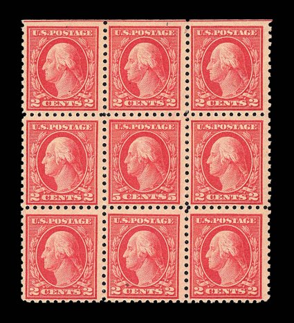 1845 og/nhbl 467 image#467, 5c Carmine error, single error in a block of nine, quite fresh, bright color, attractively centered, o.g., couple of 2c stamps lightly hinged, rest n.h. including the error, top center 2c stamp with trivial thin specks, otherwise fine-very fine. (Image) 1,150.00+