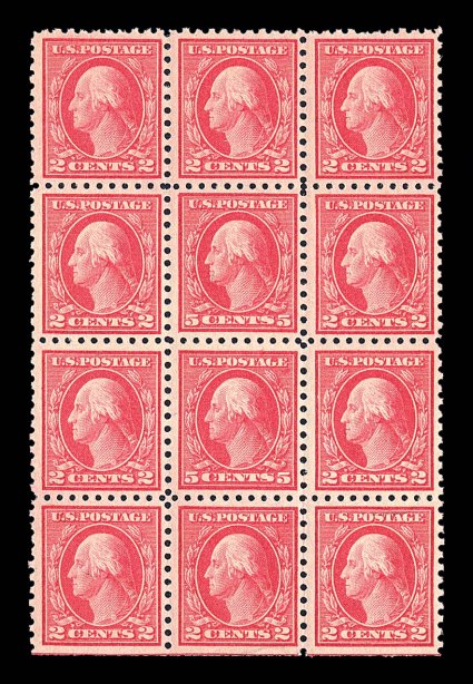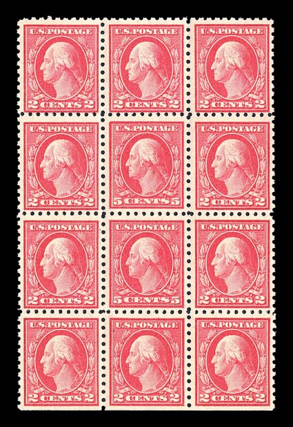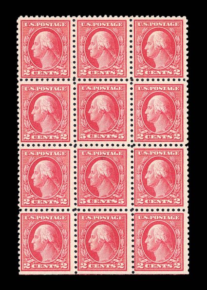 1846 nhbl 467 image#467, 5c Carmine error, marvelously fresh double error in block of twelve, bright color on fresh white paper, the two error stamps are unusually well centered, o.g., n.h., top error stamp with tiny natural inclusion, otherwise choice very fine. (Image) $3,250.00