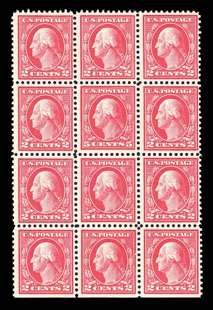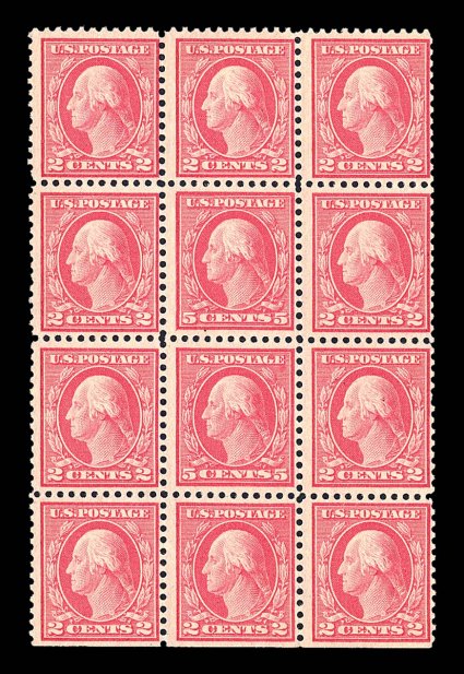 1902 og/nhbl 505 image#505, 5c Rose error, double error in a block of twelve, o.g., two 2c stamp l.h., others including both error stamps n.h., light natural gum bend affects the bottom error stamp, fine. (Image) $1,300.00