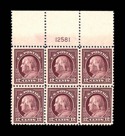 1908 nhPB 512 image#512, 12c Claret brown, full top margin plate no. 12581 block of six, well centered, fresh and crisp, o.g., n.h., very fine and quite choice; 2001 PF certificate. (Image) $210.00