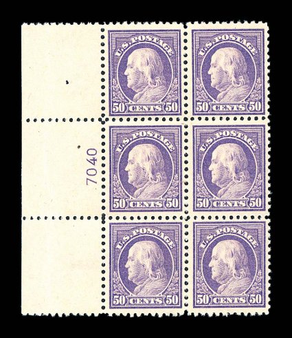 1918 nhPB 517 image#517, 50c Red violet, full left margin plate no. 7040 block of six, strong rich color, o.g., n.h., trivial natural paper wrinkle in selvage only, very fine. (Image) $2,550.00