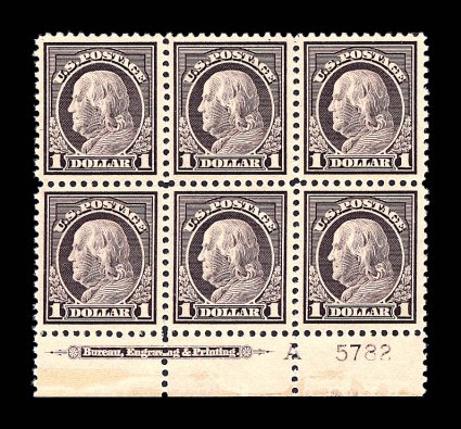 1921 nhPB 518 image#518, $1.00 Violet brown, bottom margin imprint and plate no. 5781 block of six, excellent centering, rich color, o.g., n.h., choice very fine. (Image) $2,100.00