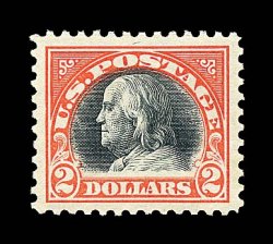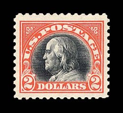 1925 nh 523 image#523, $2.00 Orange red and black, an incredibly choice mint example of this high value, brilliantly fresh, with especially vivid and unoxidized colors, flawlessly centered amid lavishly large margins, pristine o.g., with just a couple of natural gum bends endemic to this stamp, n.h., extremely fine; actually a very scarce stamp to find in this premium never hinged condition. (Image) 1,250.00