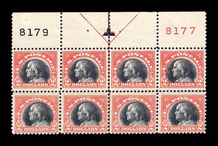 1928 ogPB 523 image#523, $2.00 Orange red and black, full top margin arrow and plate nos. 8179, 8177 block of eight, strong colors, o.g., barest trace of hinging, light natural gum bends, small corner selvage crease at top left, several perfs. had become separated and have been neatly rejoined, very fine appearance; a presentable example of this rarely offered plate block. (Image) $12,000.00