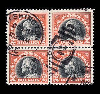 1929 Obl 523 image#523, $2.00 Orange red and black, scarce used block of four, well centered and margined (especially the top stamps), strong colors, crisp duplex cancel, very fine-extremely fine; 2003 PSE certificate. (Image) $1,300.00